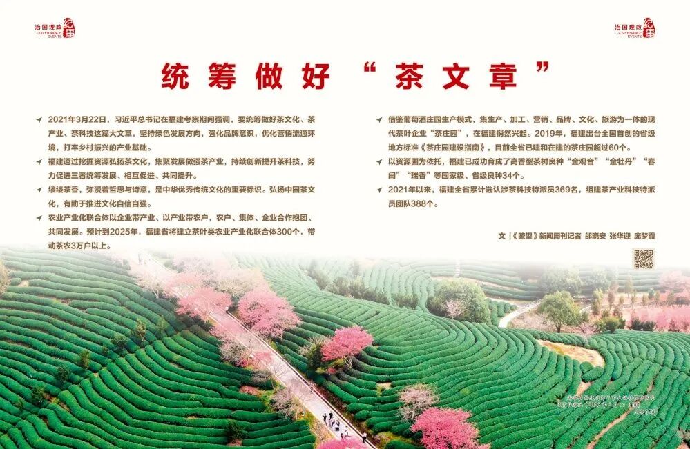 作为我国重点茶区,福建的茶文化源远流长,茶产业规模居全国前列,涉茶人口众多,是多彩中国茶大家族中一颗闪亮明珠。千百年来,茶深深融入百姓日常生活,成为文化传承发展的重要载体。早在福建工作期间,习近平同志就把茶业作为精心培育的七大优势产业之一,调研足迹踏遍重点茶区。党的十八大以来,总书记在地方考察中多次深入茶乡,为茶业健康发展指明方向。2021年3月22日,习近平总书记在福建考察期间强调,要统筹做好茶文化、茶产业、茶科技这篇大文章,坚持绿色发展方向,强化品牌意识,优化营销流通环境,打牢乡村振兴的产业基础。以此为指引,农业农村部等多部门先后出台《关于促进茶产业健康发展的指导意见》等文件,加强引导扶持,提升茶产业质量效益和可持续发展能力。2021年8月,福建省农业农村厅出台《关于统筹做好“茶文化、茶产业、茶科技”这篇大文章推动茶产业高质量发展的若干意见》,制定专项政策措施,各茶叶重点市县相继成立工作小组、工作专班,通过挖掘资源弘扬茶文化,集聚发展做强茶产业,持续创新提升茶科技,努力促进三者统筹发展、相互促进、共同提升。