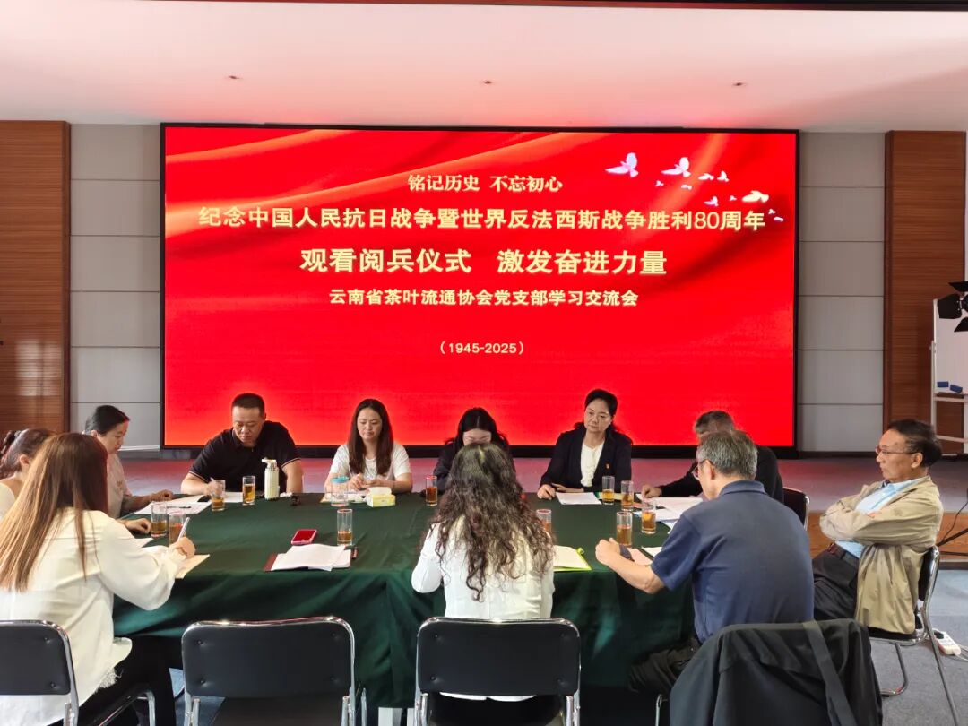 2025 年 9 月 17 日,党支部组织全体党员、服务组成员以及云南云茶职业技能培训学校、云南茶叶评价检测溯源中心人员,开展“观看阅兵仪式 激发奋进力量”学习交流会。共同回顾中国人民抗日战争暨世界反法西斯战争胜利波澜壮阔的历史,在铭记历史中汲取奋进的力量,为助力云茶产业的高质量发展注入精神动力。