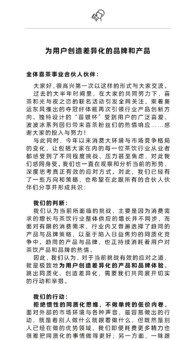 9月18日,喜茶向事业合伙人发布了一封名为《为用户创造差异化的品牌和产品》的内部信。信中喜茶表示,趋同的产品与品牌,正持续消耗着消费者对茶饮产品和品牌的热情,面对这一局势,喜茶决定“拒绝惯性的同质化思维、不做单纯的低价内卷”。