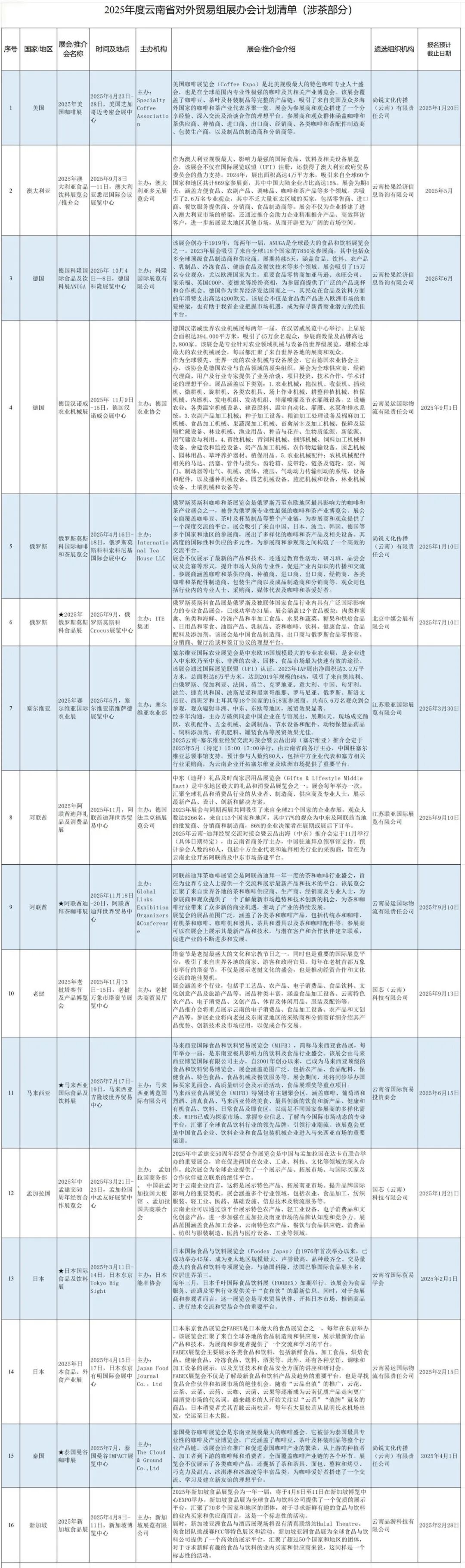 为促进“云茶”的海外销售和流通,我会应省商务厅要求组织协会会员企业参与,协会将依托“云企出海联盟”为企业搭建出海、集群式发展合作平台,为参展会员单位做好服务工作,诚邀有意向的会员单位积极响应参加。现预通知,请有需求的企业关注协会相关信息发布。咨询、报名咨询请联系协会办公室。以下为涉茶类计划清单: