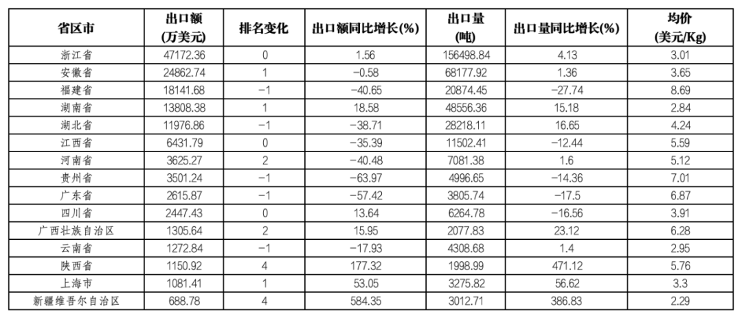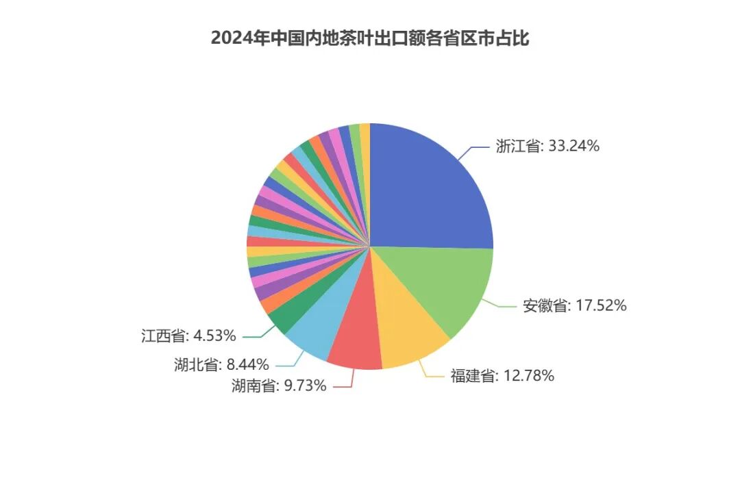 2024年茶叶出口额前5省区市依次为浙江省 、安徽省 、福建省 、湖南省 、湖北省,分别为4.72亿美元、2.49亿美元、1.81亿美元、1.38亿美元、1.20亿美元,合计占茶叶出口规模的81.70%。表格 2 2024年中国内地茶叶出口额前15省区市