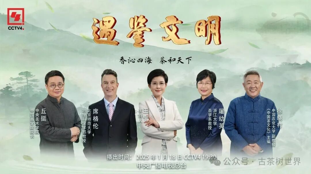 茶和天下》在CCTV4中文国际频道播出,让人们共赴一场跨越时空的茶文化交流之旅,传播中国茶文化,与世界共享美好。节目邀请了浙江大学茶学系教授屠幼英、中国农业大学副教授和《中国茶文化》主编徐晓村、中央美术学院中国画学院院长丘挺,以及来自澳大利亚的北京师范大学地理科学学部教授席格伦做客演播室,共同展现“茶”这张中国文化名片的魅力。